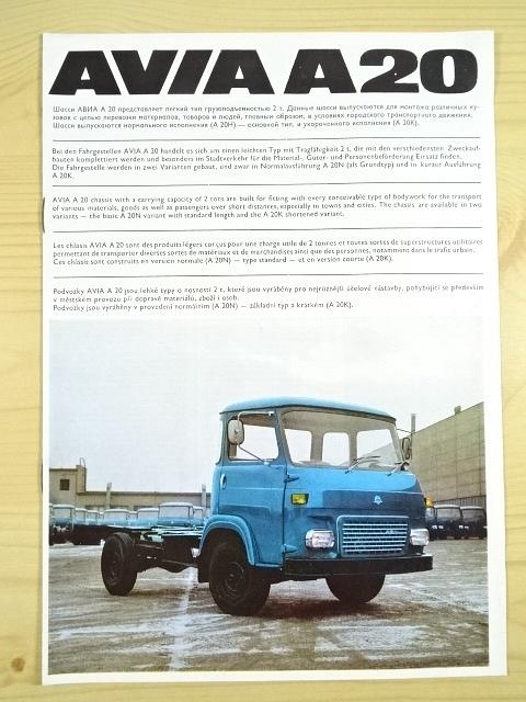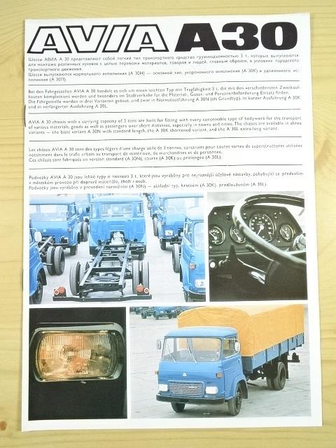 Avia A 20 valník s plachtou, A 20 F Furgon, A 30 K-CA cisternový automobil, A 30 N-SPP pojízdná prodejna potravin, A 30 N-SPEA skříňový automobil pro rozvoz pečiva, A 30 N-SPO skříňový přepravník osob, A 30 N-SPt pojízdná pošta, A 30 N-SDO pojízdná opravárenská dílna, A 30 K-S sklápěč jednostranný, A 30 valník s plachtou, A 30 N-PK valník s prodlouženou kabinou řidiče, A 30 N-SJA skříňový automobil s jednotnou karoserií, A 30 L-SJA , A 30 L-SNAA skříňový automobil pro přepravu nábytku,  Avia 712.11, Avia 712.13,  Avia A 20 podvozek, Avia A 30 podvozek, Avia A 21, Avia A 31